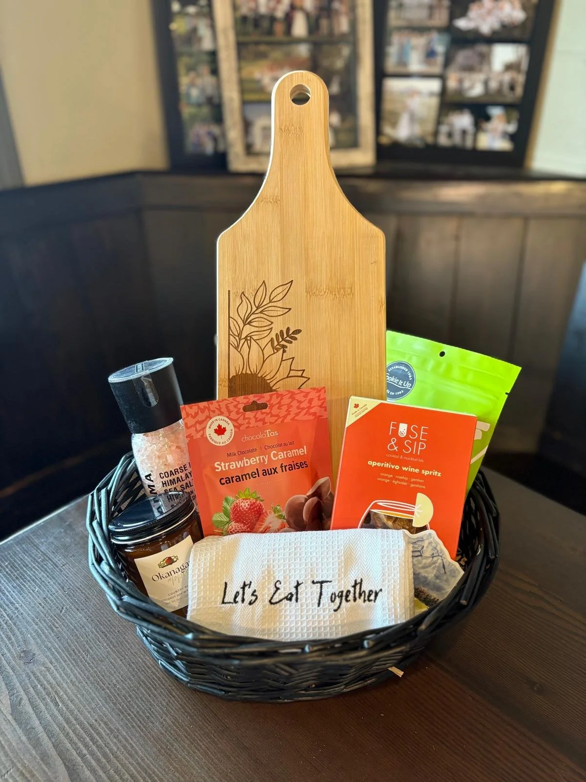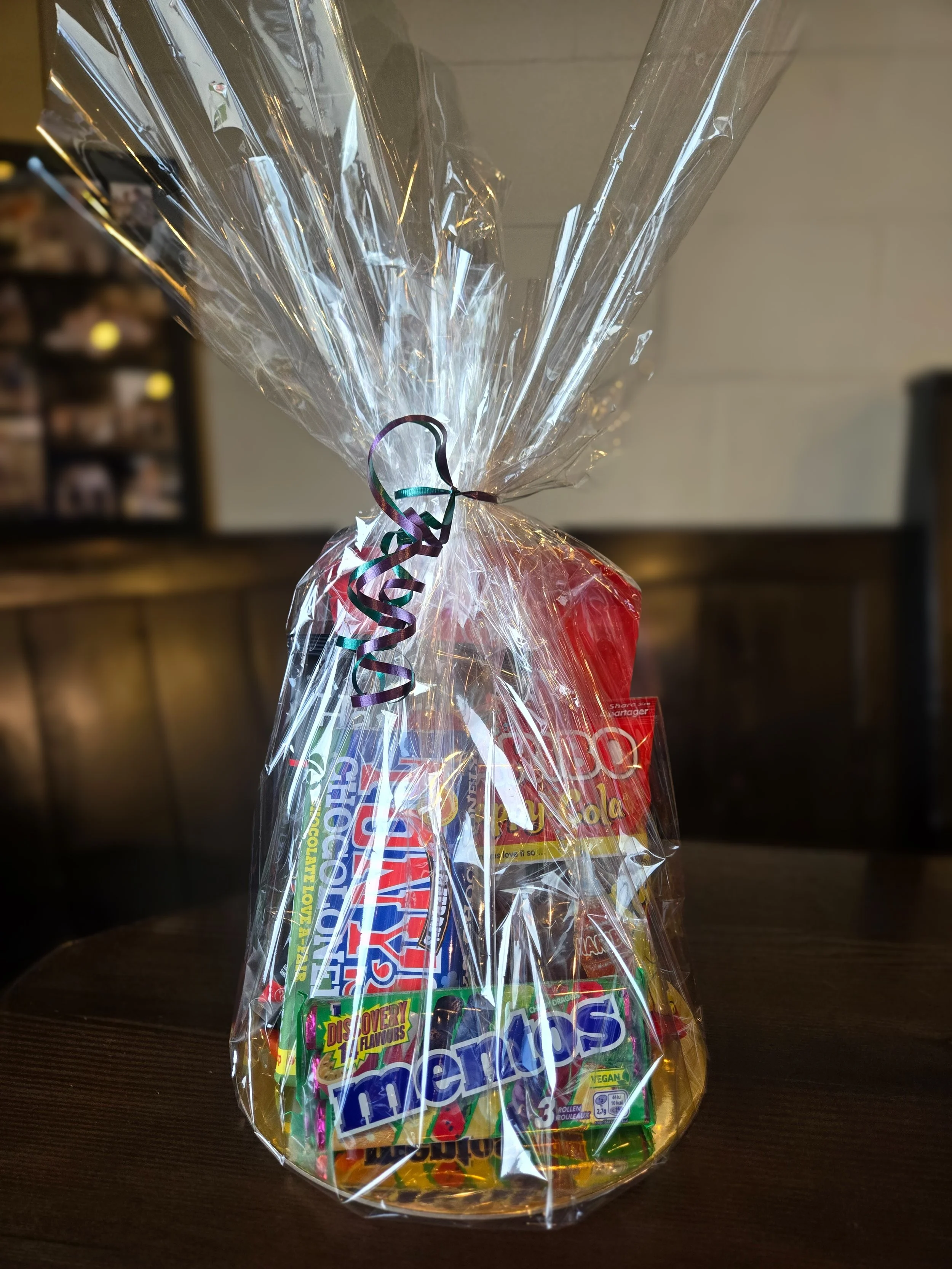 This Gift Pack (No Basket) features a candle from Local Country Rose, Chocolates from Local Chocolatas, Local The Bog Chocolate Cranberries and a cocktail/mocktail syrup from Local Fuse & Sip!