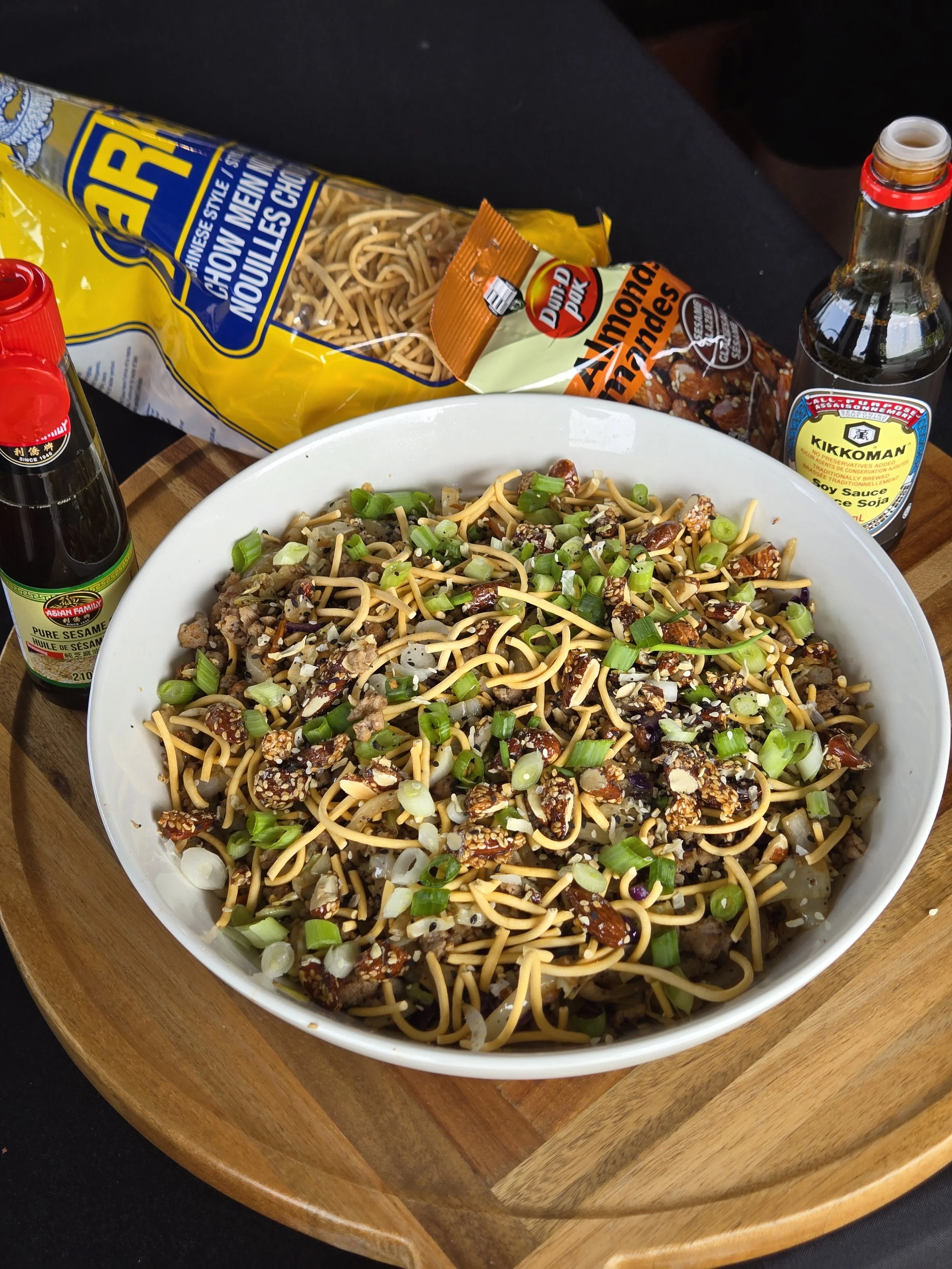 Top with dried Farkay noodles, sesame almonds, more everything spice, and sliced green onions.