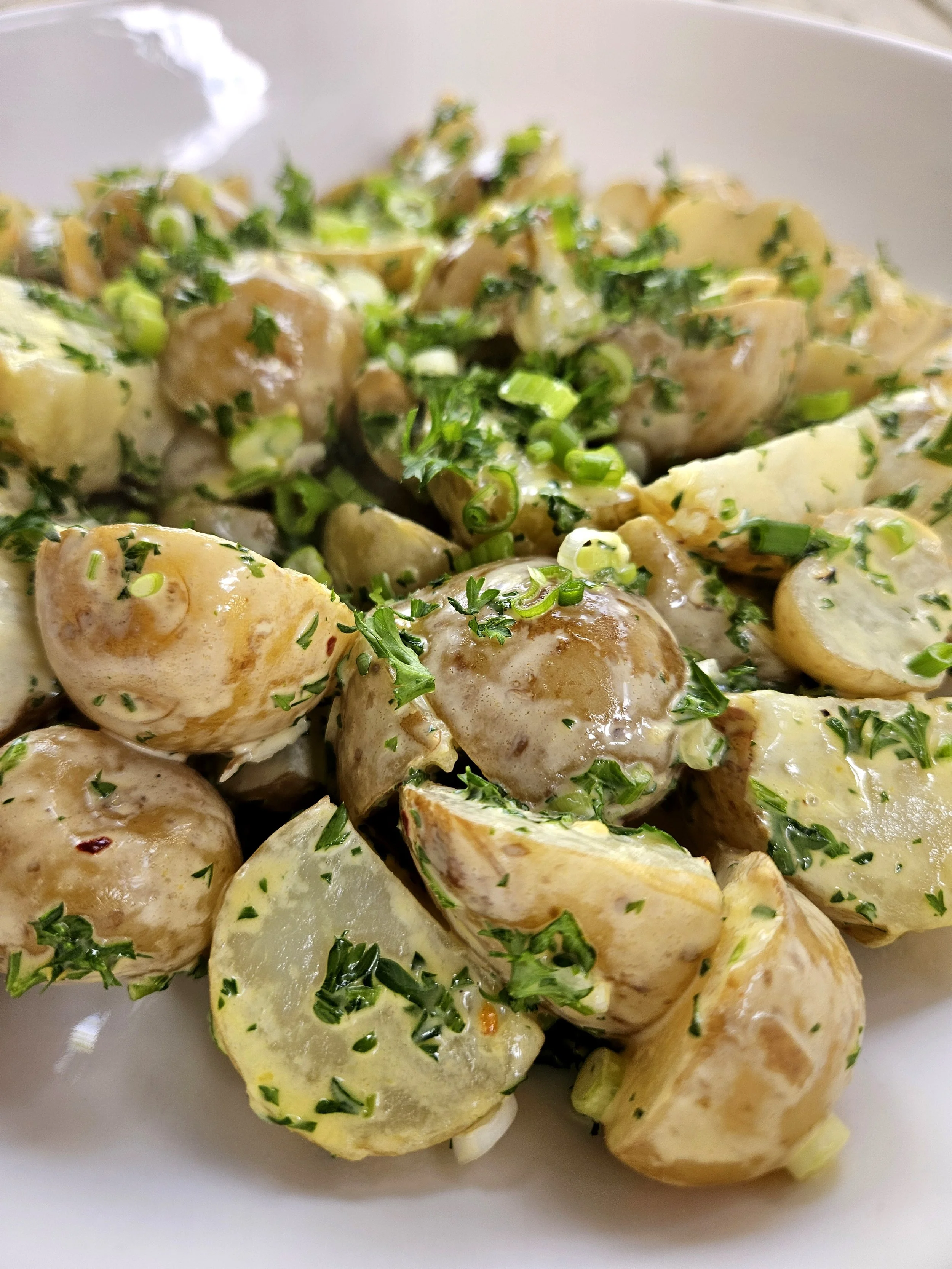 In a large salad bowl, combine all the dressing ingredients and whisk until smooth. Next, boil the potatoes in a pot over high heat until softened (approximately 20-25 minutes). Strain & add the warm potatoes to the salad bowl, toss until coated in the dressing, then fold in the parsley and green onion. Enjoy with your favourite BBQ meats!